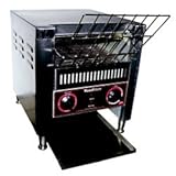 Product OverviewsIf you do a ton of toasting, there is a model of this countertop toaster to meet your needs. Choose from three options, ranging from 250 to 750 pieces of toast per hour. This belt toaster pulls breads, bagels, muffins, and rolls through quickly and easily to get them toasted as dark or as light as you want 'em. Thick or thin, big or small, you'll get an even toast every time. The dials on the front control belt speed and toasting mode to meet any customer need. This high-quality commercial design features durable stainless steel body, a removable crumb tray for easy cleaning and a "standby" setting to conserve energy. Let cafeteria and dining hall guests toast their own stuff or use it on the line in your busy commercial kitchen. Features: Select "FullToast", "TopToast", or "Standby" mode. Able to handle most sizes and shapes of breads, bagels, buns, or muffins. Angled loading rack allows continuous feeding. Front or rear product dispensing capability. Energy saving standby function. Stainless steel conveyor belt. Removable crumb tray. Specs: CT-250 dimensions: 11 1/2"W x 15"H x 16 1/2"D. CT-250 electrical: 120V, 1.5kw, 12.5 amps. . CT-500 dimensions: 14 1/2"W x 15"H x 16 1/2"D. CT-500 electrical: 240V, 2.6kw, 10.8 amps. . CT-750 dimensions: 18 1/2"W x 15"H x 16 1/2"D. CT-750 electrical: 240V, 3.2kw, 13.3 amps.