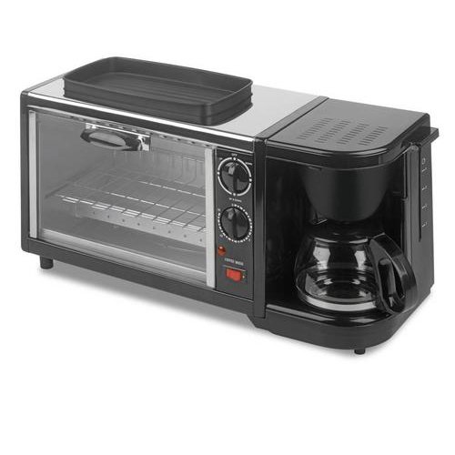 Product OverviewsBSET1 Features: -Stainless Steel and Black finishes -Combination unit with mini toaster oven, coffee maker, and griddle -650 watt coffee maker brews 4-6 cups of coffee or tea -800 watt toaster oven -15-minute timer -Removable crumb tray -Non-stick hot plate and baking tray for effortless food release -1 Year Manufacturer's Warranty -Overall Dimensions: 10'' H x 20'' W x 8'' D Make hot coffee, crisp toast, and a fried egg with this unique 3-in-1 Toaster Oven Breakfast Set. The appliance combines a mini toaster oven, a coffee maker, and a griddle into one compact unit. The 800-watt toaster oven can warm or toast breads, heat pot pies, or cook mid-size frozen foods. The griddle allows for cooking up an egg, hamburger, pancake, or sausages. With this breakfast set, it'll serve a great purpose for college dorms or countertops with limited amounts of space!