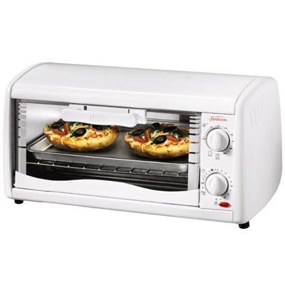 - Sunbeam 4 Slice Toaster Oven features include oven temperature control, baking pan with broiler rac