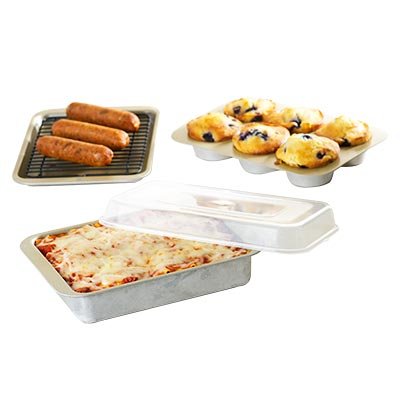 - Baking sheet: 7" x 10" pan is great for reheating leftovers, making just a few cookies or rolls at a time Broiling rack: Fits inside both the casserole and the baking sheet Storage cover: Fits the muffin pan, casserole, and baking sheet to keep foods fresh